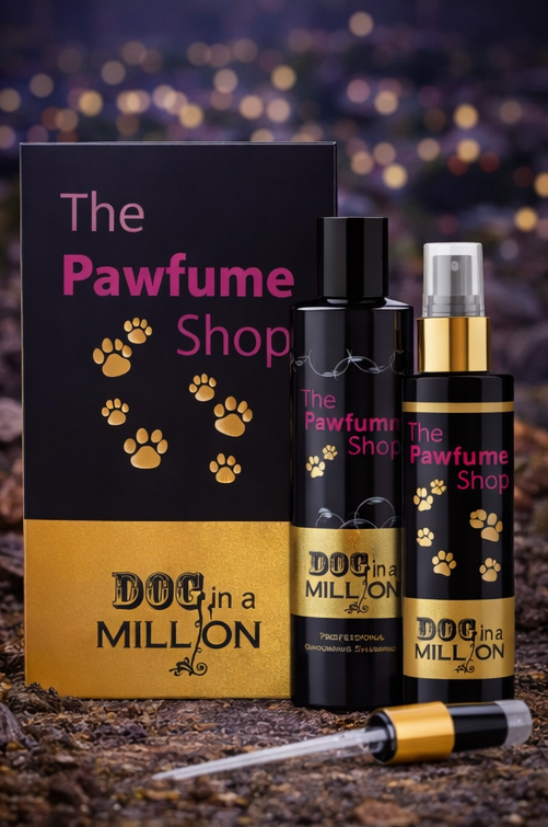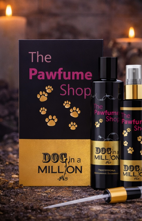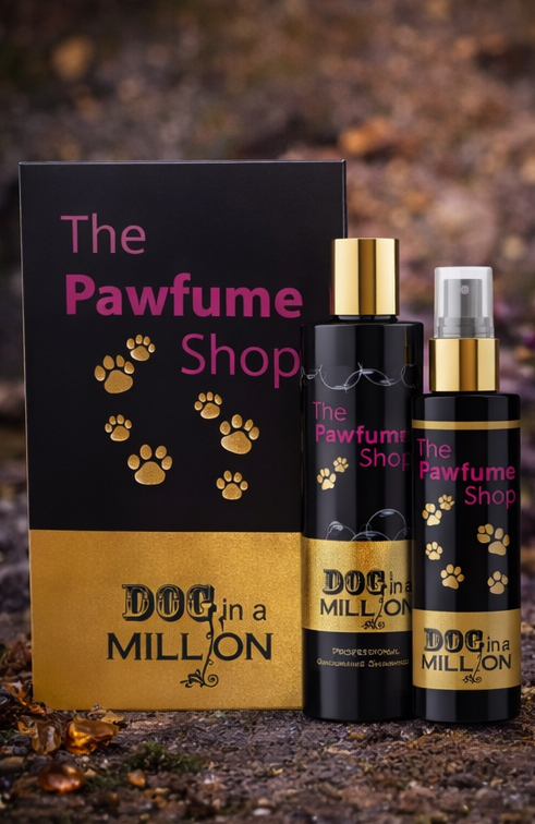🐾 Dog in a Million Pawfume (100ml) – A masculine, woody, and spicy fragrance designed to refresh and deodorise coats, with chamomile extract for skin comfort.